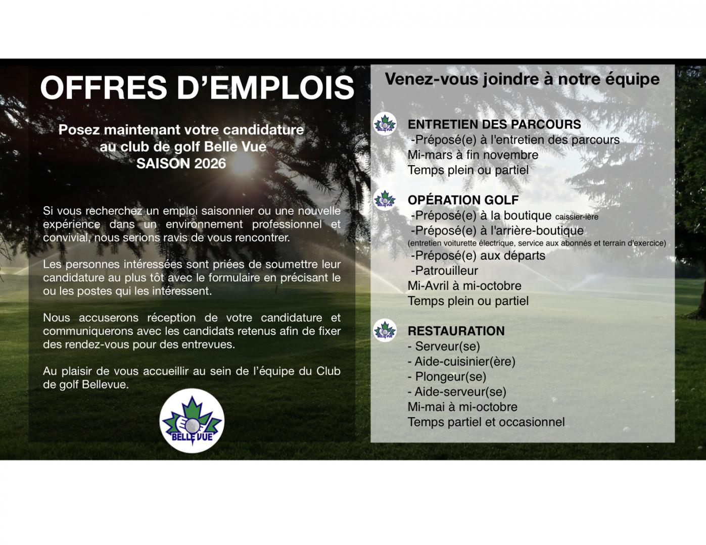Posez maintenant votre candidature au club de golf Belle Vue pour la SAISON 2026